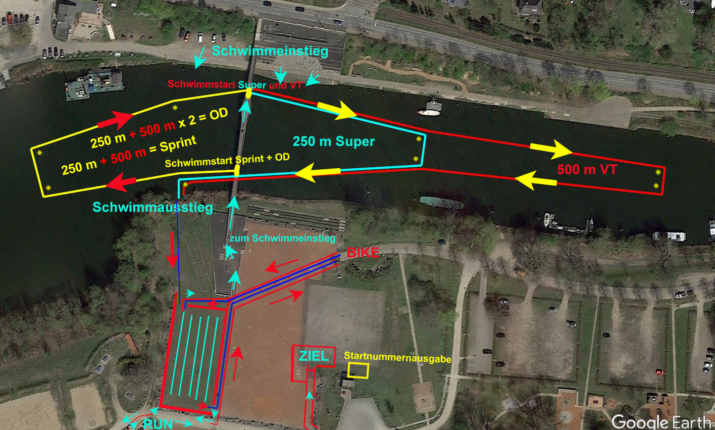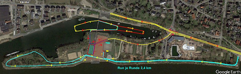 Start- und Zielbereich ist auf dem Menzer-Werft-Platz in Geesthacht. Nachdem die Schwimmstrecke von 250 m / 500 m / 750 m / 1.500 m absolviert wurde, geht es mit dem Rad ab der Wechselzone auf einen 10 km Rundkurs der einmal/zweimal/viermal zu fahren ist. Zurück in der Wechselzone folgt für alle die a. 2,4 km Runde Laufstrecke. Diese ist einmal/zweimal/viermal zu laufen. Dann bist du im Ziel.