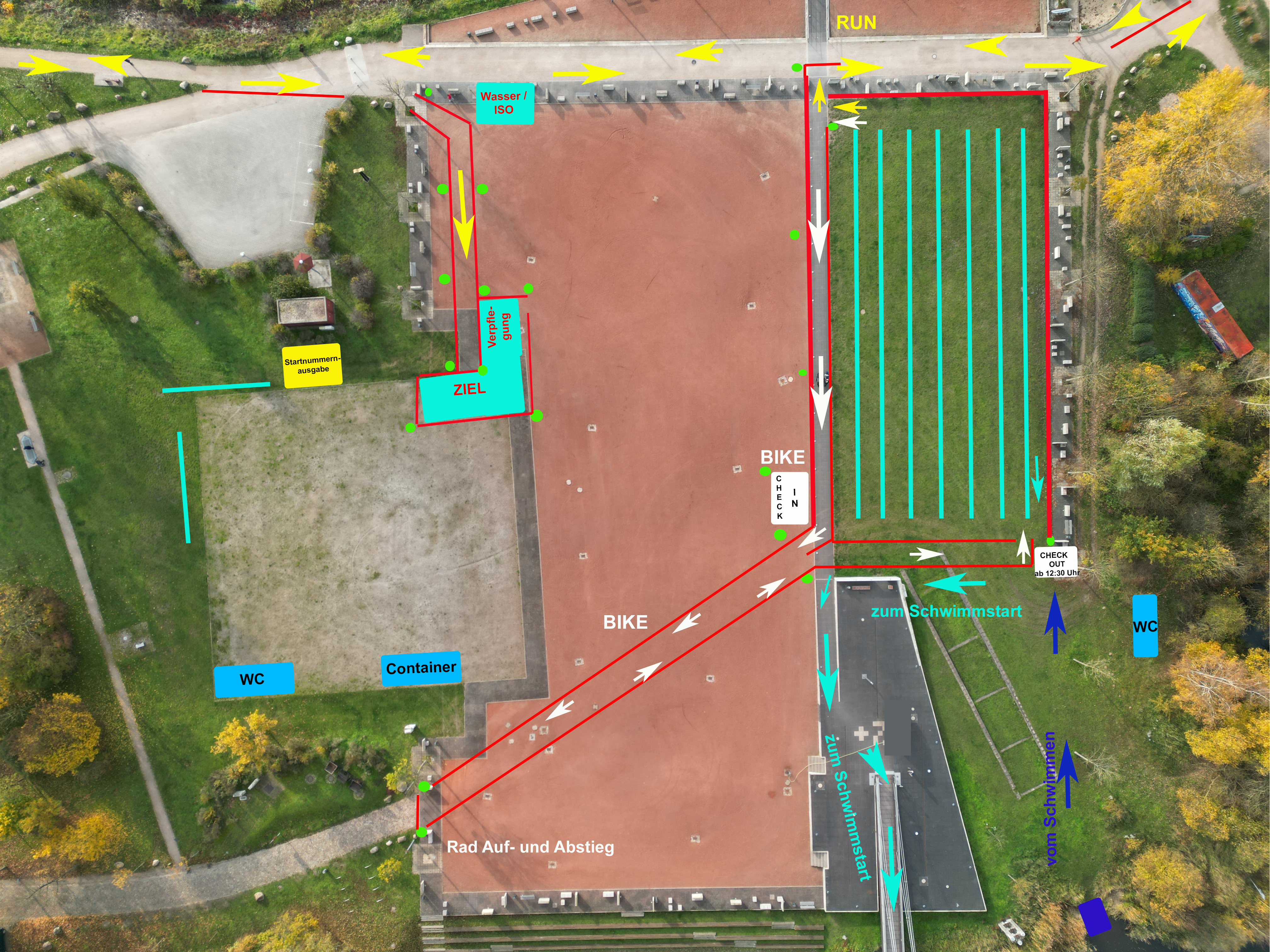 Achtung: Bitte nicht direkt vorn an der Badeanstalt parken. Weiter hinten zum Werft Gelände, also näher an Start und Ziel, sind zahlreiche Parkplätze verfügbar. Es besteht jedoch nur bis 09:00 Uhr Zufahrt- und dann wieder ab ca. 14:00 Uhr Abfahrt Möglichkeit.